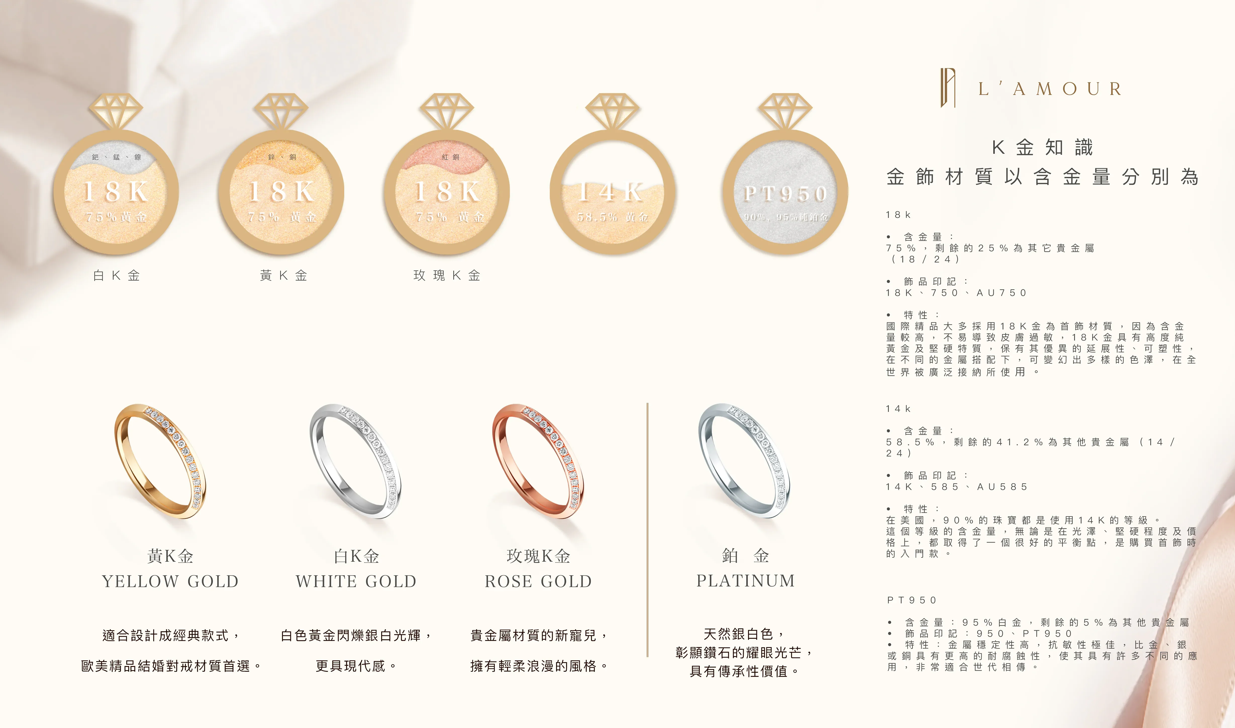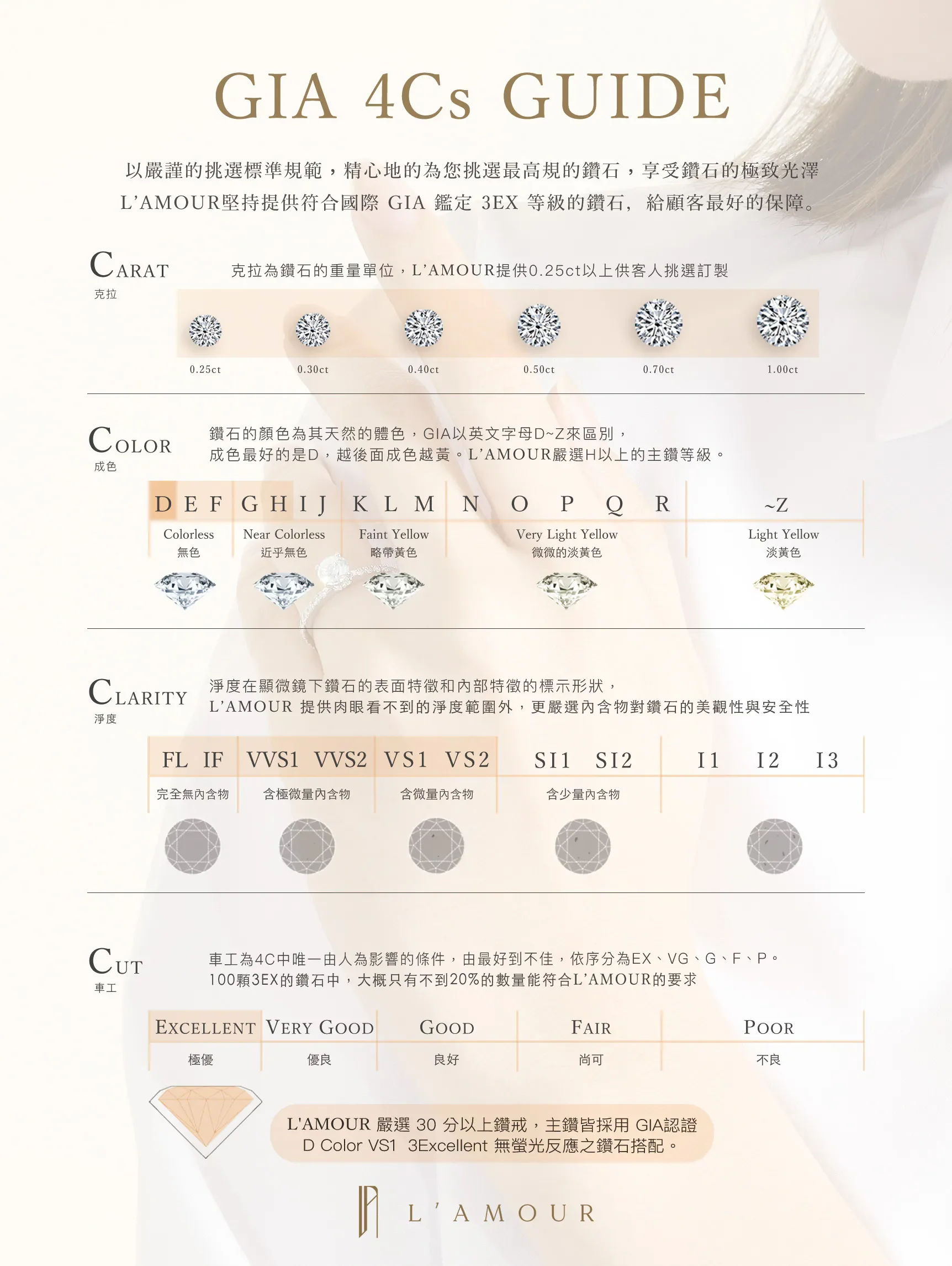 L'AMOUR 嚴選 30 分以上鑽戒,主鑽皆採用GIA認證 D Color VS1 3Excellent無螢光反應之鑽石搭配。